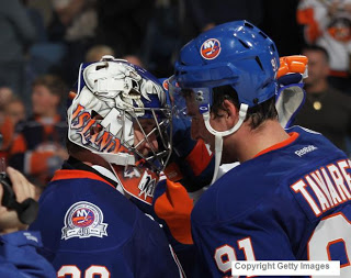 Considering all the bad news surrounding Sidney Crosby, it’s nice to see others stepping up in his place. If only Ryan Getzlaf was one of them. 😛 Hey. Older teammate Teemu Selanne paces the Ducks with 49 points, proving that the Finnish Flash could probably play another five years. Let’s hope so. Tavares’ outstanding play has the Islanders thinking playoffs again. And while it’s still a long shot with the Devils dismantling the Flyers today (at last check 6-0 at Wachovia) and Toronto still nine clear also in action later, the Islanders still have to climb over three teams to make it. A pivotal match against Buffalo looms large for both Battle clubs. Each trying to gain ground. The Isles have gotten solid play from Evgeni Nabokov while Ryan Miller is finally looking like a former Vezina winner. Two huge points up for grabs. It’ll probably be tight.