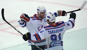 | Ilya Kovalchuk (seen here with Vladimir Tarashenko) participated in SKA’s KHL game Tuesday, leaving speculation that he might not return to the Devils for the abbreviated 2013 season. |