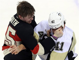 The Sens had chances to get back in it. They out-shot the Pens 14-9 in a penalty marred opening stanza. That included matching cross checks between Daniel Alfredsson and Robert Bortuzzo. It heated up with seven seconds left when Bortuzzo dropped the gloves with Zach Smith during a post-scrum. Neil mixed it up with Steve MacIntyre, drawing an extra two on the Pens enforcer. That drew the ire of Brooks Orpik.