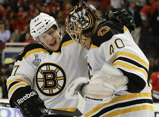 The Hawks dominated the first getting the lone goal from Patrick Sharp on a follow up thanks to a tremendous shift from Patrick Kane with Michal Handzus screening Tuukka Rask. So lopsided was the period that they out-shot the Bruins 19-4. Only stupendous goaltending from Rask kept Boston alive. He stood on his head. Chicago came at them in waves but were turned away for the final 62:26 by the omitted Finnish netminder who finished fifth for the Vezina. Rask made 33 saves.