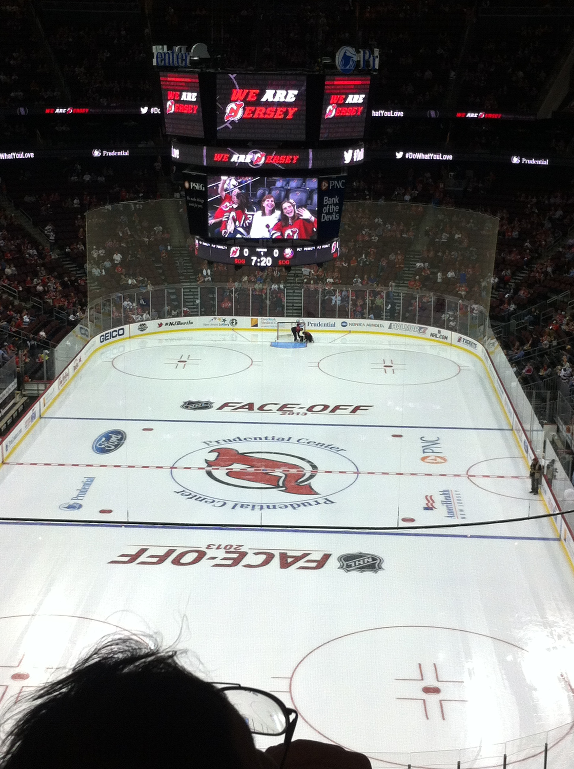 I went inside just after 6 to get my ticket lanyard which I’ll probably never use anyway (though as I pointed out to someone later it’s useful if you’re going into your section with food, so you don’t have to grab the ticket out of your pocket), then went towards section 10 to see my two sth buddies down there during warmups. One of them told me she didn’t get anything from the Devils that she was supposed to – either her food/beverage card or her RSVP to the season ticket holder barbeque/meet and greet at the Prudential Center last week. I was lucky enough to go but I had to e-mail and ask for the RSVP link. Then I didn’t get my ticket that I was supposed to print out so I had to ask for one at the arena and hope they had me on the list. I suppose it’s inevitable with ownership changes and the restructuring of the sales department (having eight ticket reps now instead of three) some things are going to fall through the cracks. Kristi didn’t get her lanyard either, I told her just to do it during an intermission because the line was too long now but she did try the line after warmups – don’t know whether she and her brother eventually got theirs though. Funny that the first song in warmups was ‘The Boys Are Back’ from Dropkick Murphys, which happens to be one of the songs in NHL14 but also fits as an opening song. Apparently Danius Zubrus (who moonlights as the team dj) is a better judge of picking songs than the team itself…more on that soon.