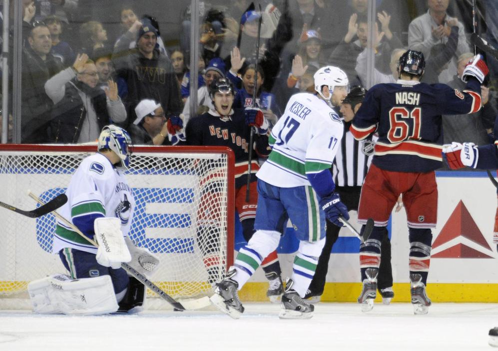 It only got worse for Tortorella’s Canucks. Nash scored 17 seconds into the second increasing the lead to three, chasing Luongo (3 GA on 10 shots). It was his fourth goal since returning and increased his goal streak to three. Stepan and Dan Girardi picked up assists. Another Canuck penalty was punished. This time, Vigneault target Mike Del Zotto converted his second from Mats Zuccarello and Derick Brassard. It had to feel extra sweet for Del Zotto, who’d been a healthy scratch the last two and five of the last eight. He was reinserted for John Moore, who sat out along with Taylor Pyatt. He was replaced by a healthy Derek Dorsett, who wasted no time in the third fighting Tom Sestito.