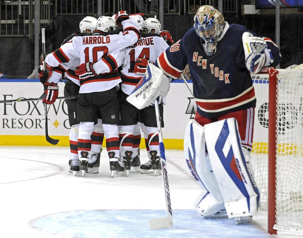 A dejected Henrik Lundqvist can’t look as the Devils congratulate Michael Ryder on his eighth goal. The Rangers rallied to tie but lost in overtime to their Hudson rival.