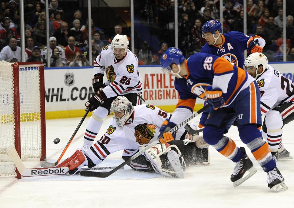 Despite Chicago controlling much of the first, Casey Cizikas scored the lone goal. The Blackhawks got tons of pressure outshooting the Islanders 12-5 but couldn’t beat a razor sharp Nabokov. It was a sloppy turnover that resulted in Cizikas beating Crawford on a breakaway for his fifth. Bryan Bickell fumbled a Johnny Oduya outlet allowing Cizikas to get behind and go forehand deke for the opening goal.