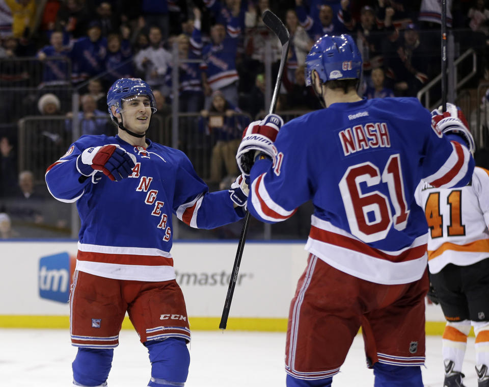 Chris Kreider is congratulated by Rick Nash after his power play goal put the Rangers up 4-0 on the Flyers.