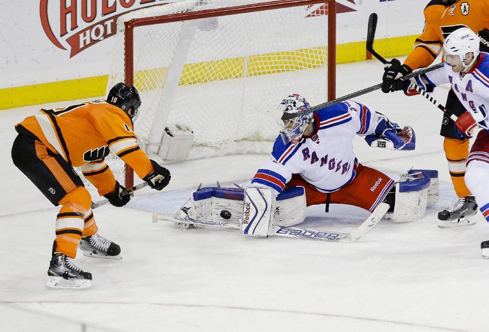 Cam Talbot denies Braydon Schenn. He finished with 31 saves in the Rangers’ 2-0 shutout over the Flyers.