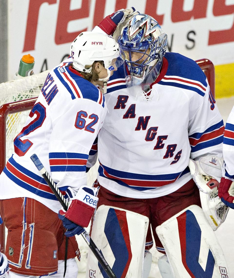 Happy Swedes: Carl Hagelin congratulates Henrik Lundqvist after his 56th career shutout. A 2-0 Ranger win over the Oilers.