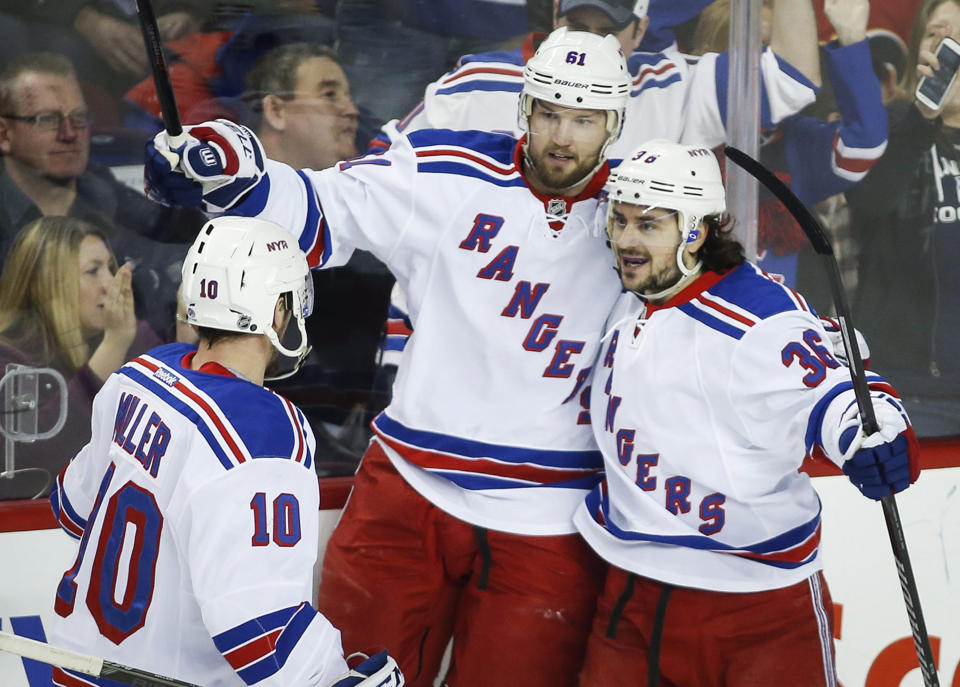 Nashty Boy: Rick Nash (center) is congratulated by J.T. Miller (left) and Mats Zuccarello (right) after scoring another goal.