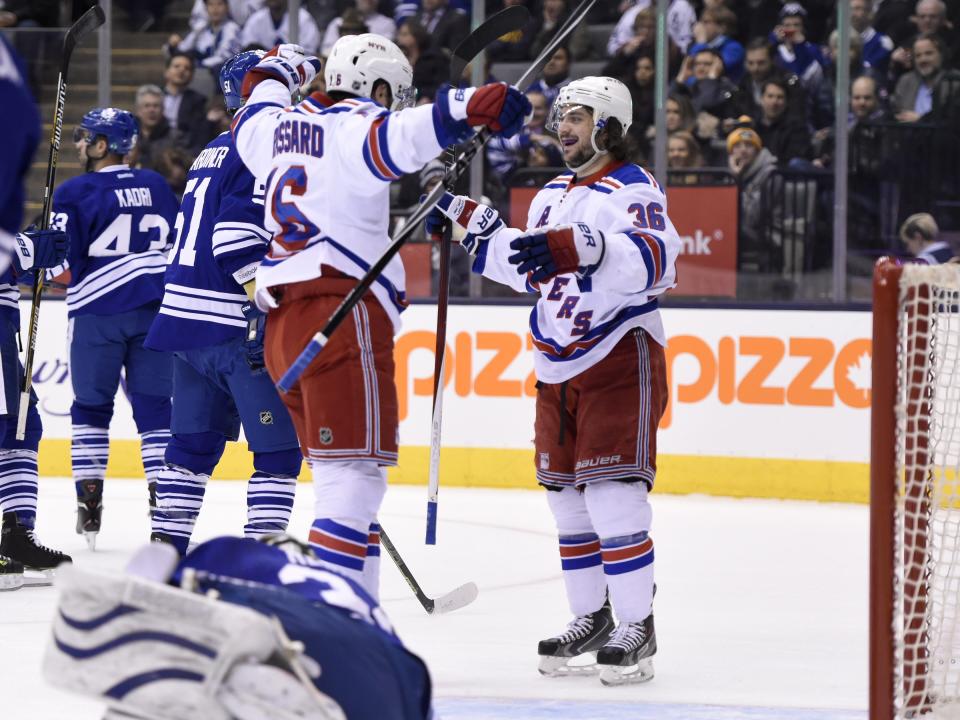 Zucc’s Back: A happy Mats Zuccarello gets congrats from Derick Brassard for one of his two goals in the Rangers’ 5-4 win over the Leafs.