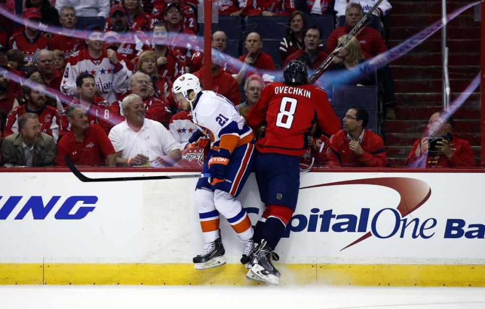 Hit Me With Your Best Shot: Kyle Okposo takes a hit from Alex Ovechkin.