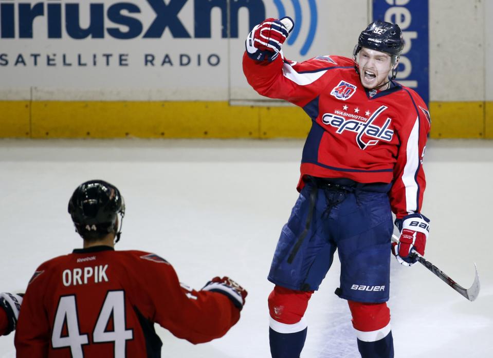 Evgeny Kuznetsov celebrates his series clinching goal with Brooks Orpik as the Caps eliminated the Islanders 2-1.