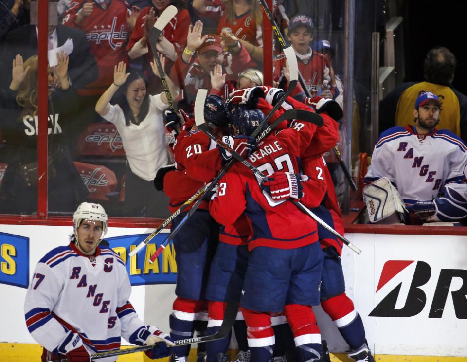 Caps mob Game 4 hero Andre Burakovsky following his second goal. Rangers captain Ryan McDonagh can only watch in disappointment. AP Photo by Alex Brandon/Getty Images