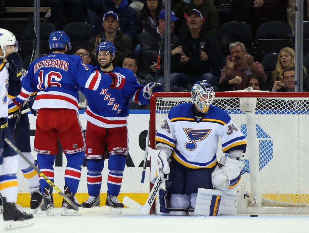 Derick Brassard and Mats Zuccarello celebrate Brassard’s early goal in another Rangers win.
