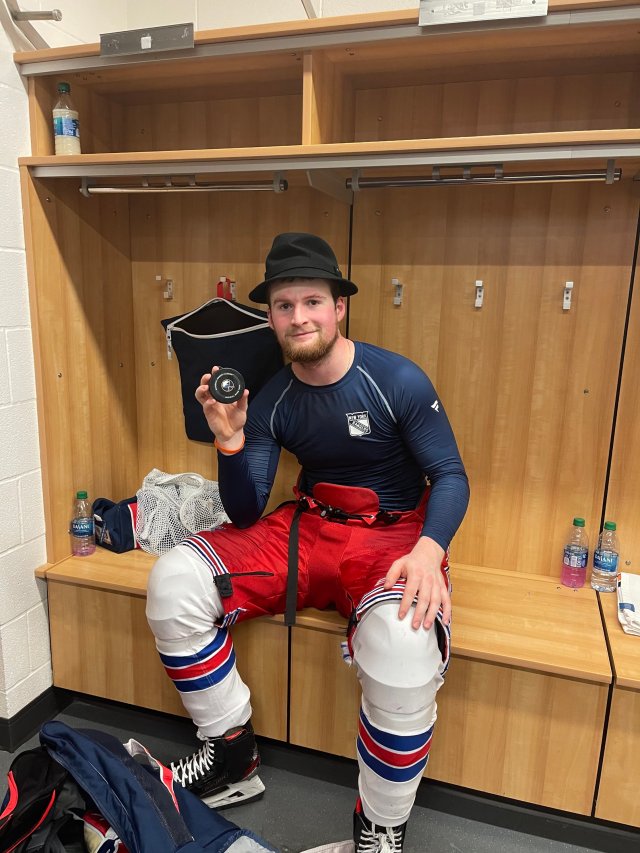 Alexis Lafreniere sits in the Rangers locker room with the puck of his memorable first NHL goal that came in overtime to defeat the Sabres. The victim was Linus Ullmark. AP Photo by New York Rangers courtesy Getty Images