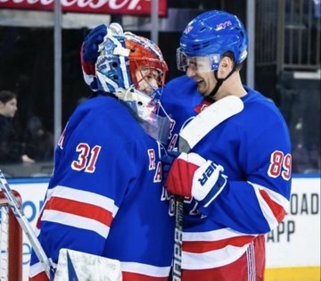 Igor Shestyorkin is greeted by Captain Happy, Pavel Buchnevich whose shorthanded empty net goal clinched a 3-0 Rangers win over the Devils for Shestyorkin’s first NHL shutout. It was hard fought with the rookie goalie the difference. AP Photo by New York Rangers via Getty Images