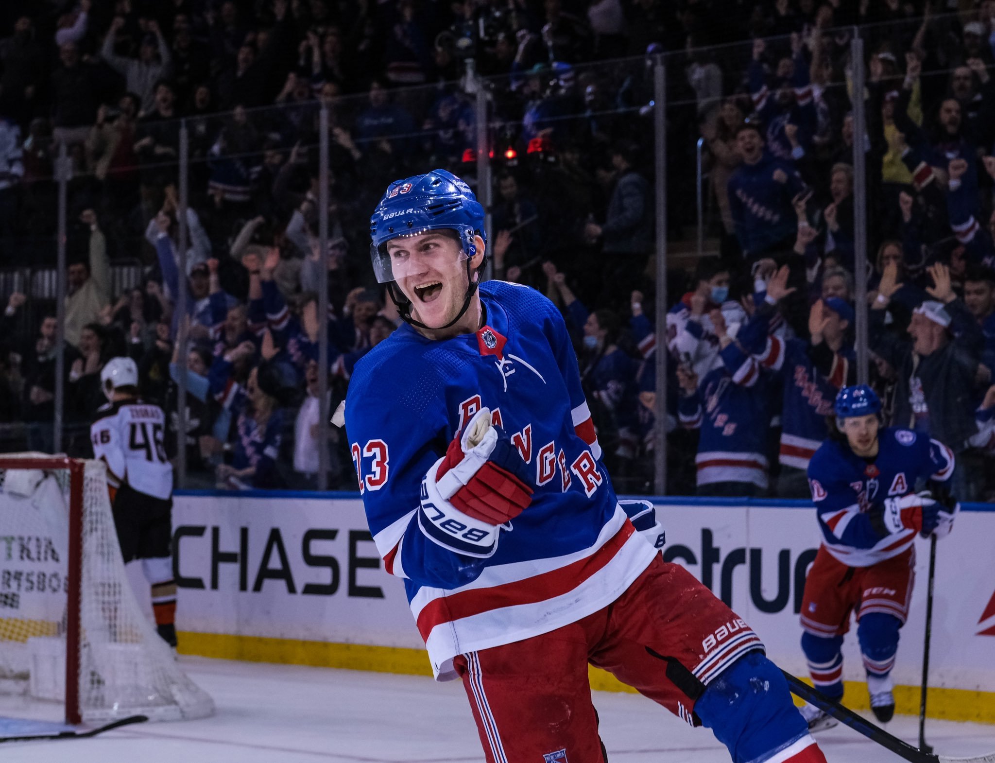 On a good defensive by Braden Schneider, he got the puck up to Chytil along the boards. He was able to move it up for Brodzinski who simply gained the Anaheim zone and fired a wrist shot from the right circle that eluded Gibson. It was his eighth career NHL goal. The first in 11 games this season. He scored one last year in a five game cameo.