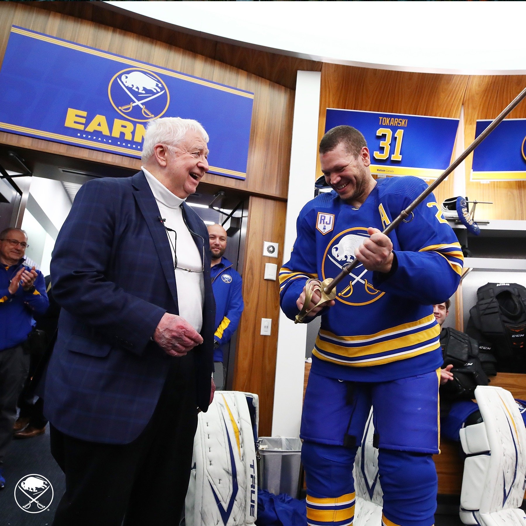 If you didn’t get choked up seeing the whole team celebrate their victory with a special team photo with RJ on the ice, I don’t know what to say. I’m glad they won. It was his night. Seeing how much he means to those players including future captain Alex Tuch, tells you everything. Kyle Okposo presented him with a stick following the win in the locker room (seen above).
