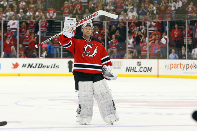 Apr 13, 2014; Newark, NJ, USA; New Jersey Devils goalie Martin Brodeur (30) is honored by fans after his 3-2 win over the Boston Bruins at Prudential Center. Mandatory Credit: Ed Mulholland-USA TODAY Sports